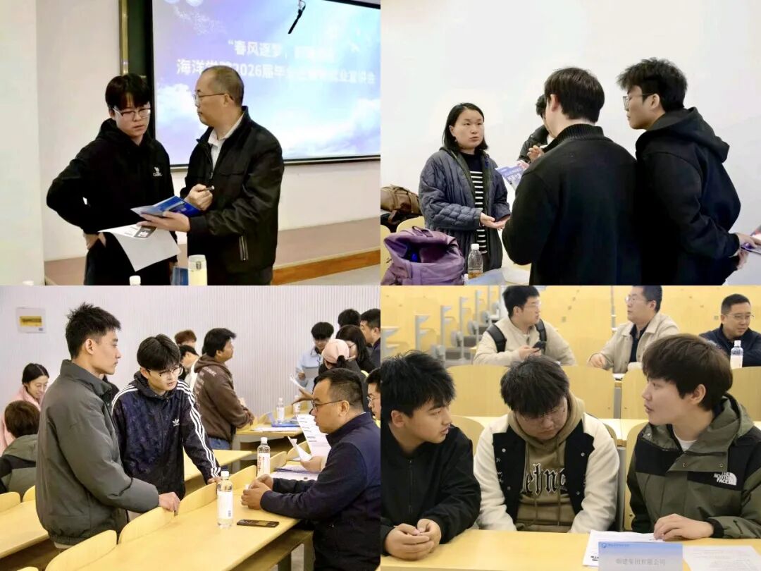 为抢抓春季促就业窗口期,近日,海洋学院在八角湾校区举办“春风逐梦,职通蔚蓝”2026届毕业生春季就业宣讲会。海洋学院党委书记马春富、副院长张健,系主任、班级导师赵海波、李学鹏、王力、郝文刚,辅导员苏璇、王鸿睿、周晓、何剑汇到场开展工作交流和洽谈,为求职学子护航。渤海水产股份有限集团、招商局船舶工业集团威海船厂有限公司、山东世华海事科技有限公司、烟建集团有限公司、中国人民财产保险股份有限公司等14家用人单位提供就业岗位300余个,招聘岗位覆盖水产、航运、船舶制造、能源动力、保险等行业领域。