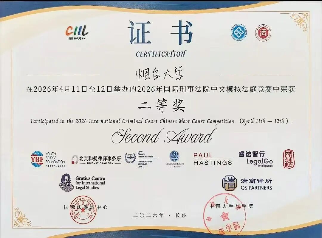 2026年4月11日至12日,国际刑事法院中文模拟法庭比赛在中南大学举办。该赛事由国际刑事法院官方支持,是全球顶级国际法模拟法庭赛事之一,以高淘汰率、强专业性著称,全面考察参赛队伍的文书撰写、法律检索、庭辩技巧与团队协作能力。烟台大学法学院代表队从全国130支参赛高校队伍中脱颖而出,最终荣获全国二等奖,总排名跻身全国前20名,书状排名位列全国第9名。