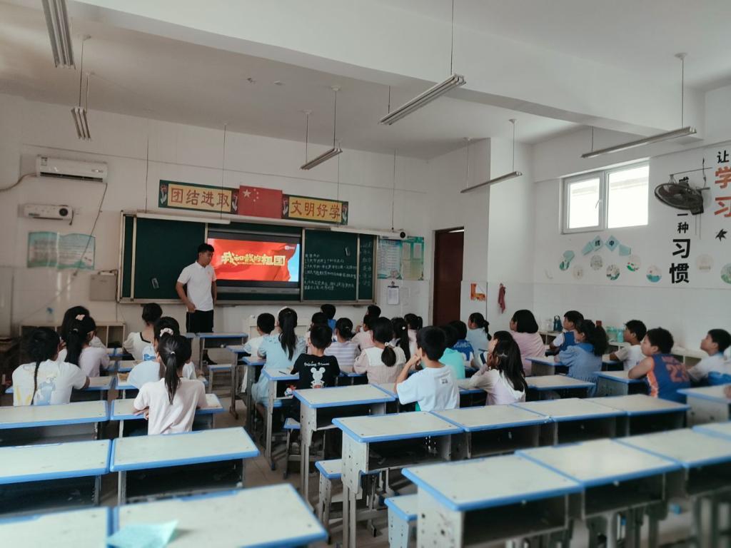 图为实践队队员正在为学生开展爱国教育课程,讲解爱国知识。烟大青年网通讯员 李昊炜 供图