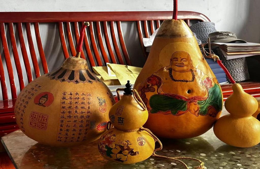 采访结束后,宋老师带领我们参观各种葫芦烙画的艺术品。葫芦上的绘画“妙笔夺天工,墨彩聚精神”,一笔一划都凝聚着匠人风骨。葫芦上的图案饱含祝福寓意,代表着博大精深的中华文化。这些艺术品,体积或大或小,图案或多或少,但它们都是非遗文化历经岁月的洗礼仍流传至今的最好见证,也是传承人的那份匠人精神以及对其信念的坚守的见证。