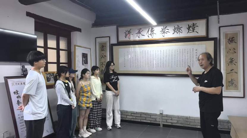 7月14日下午1时30分,实践队抵达芝罘区所城里螳螂拳基地。在基地工作人员引导下,队员们参观了历史展区,泛黄的老照片系统呈现了螳螂拳自明末清初以来的源流演变,斑驳的拳谱与传承人的名册则直观展现了技艺代代相承的历程。训练场地上,沙袋、木人桩等训练器械排列整齐,文物展示柜中陈列的刀、枪、剑、棍等传统器械,让队员们近距离感受武学智慧的实物载体。队员们分组,通过文字记录、影像拍摄等方式,细致留存各类史料与实物信息,深入挖掘这一非遗项目的历史价值。