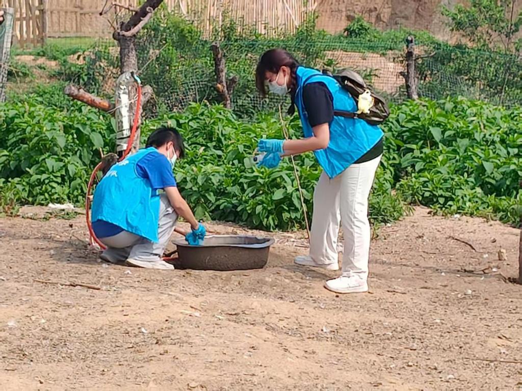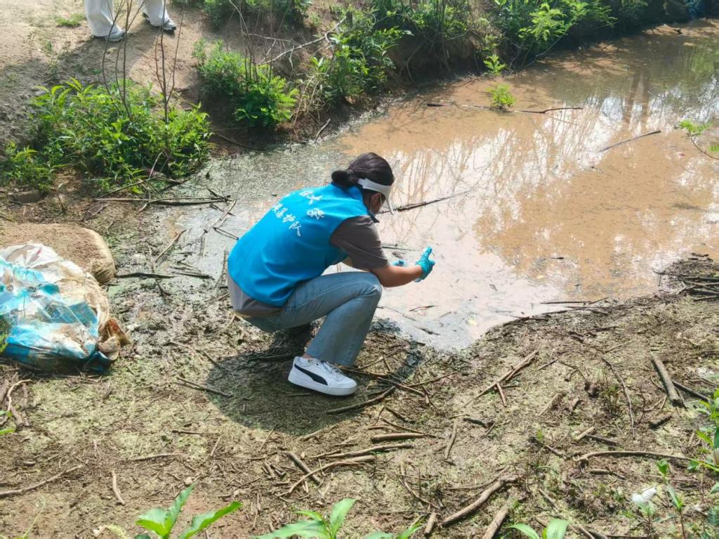 踏入畜牧养殖区域,队员即刻投身实地水样采集工作。身着统一志愿服,大家分工有序。有人蹲在简易盛水容器旁,谨慎操作采样工具;有人在沟渠边,借助针筒状器具,从布满浮萍、略显浑浊的水体里精准汲取样本。每一次采样,都承载着实践队员对真实数据的执着追求,让实践队员得以触摸到畜牧废水污染的现实“温度”,也愈发深刻地认识到生态治理必须扎根实践。