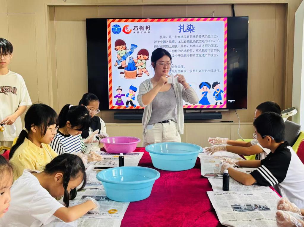 扎染区域同样人气十足。这里选取了白族、彝族等民族擅长的扎染技艺,队员们提前备好布料、染料。孩子们跟着队员,先把布料折叠、捆绑,再浸入染料。不一会儿,原本洁白的布料上,出现了蓝白相间的美丽图案。拿到自己亲手制作的扎染作品,孩子们都特别开心,纷纷向小伙伴展示。